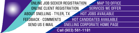 HOME | ABOUT US | SERVICES | HOT JOBS | HOT CANDIDATES | JOB SEEKER REGISTRATION CLIENT REGISTRATION | MAP | FEEDBACK | SNELLING CORPORATE HOME PAGE | NEWS | LINKS Copyright © 2004 Snelling Personnel Services. All rights reserved.